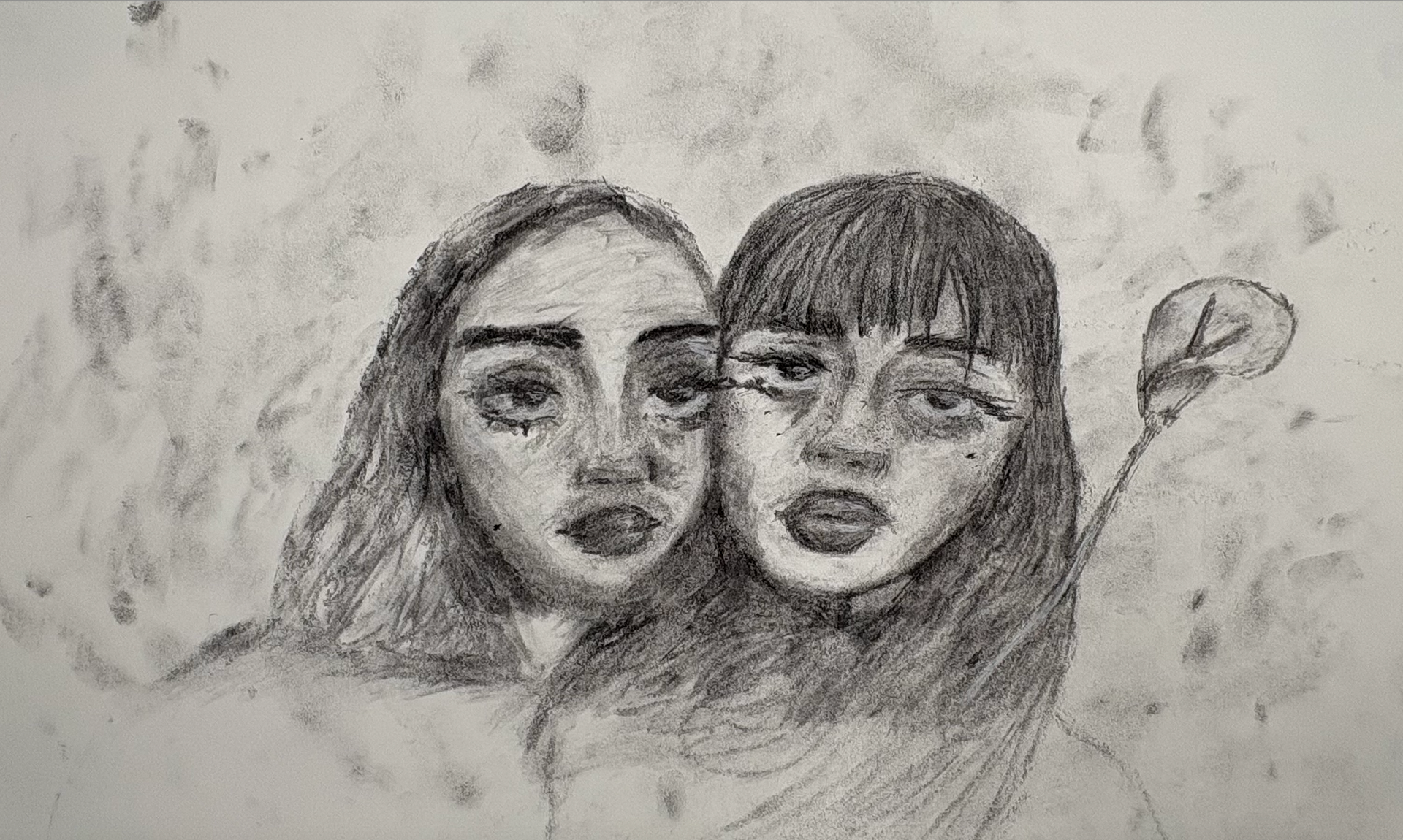 The flower symbolizes beauty, rebirth, and union. The smudged charcoal piece is meant to show what the flower represents, with that, a connection to nature. Nature can demonstrate identity, with certain plants representing one's traits. The two girls standing next to each other symbolize friendships and love, another factor in one’s identity. The Earth’s most precious beauties are what shape an identity (humans and nature).