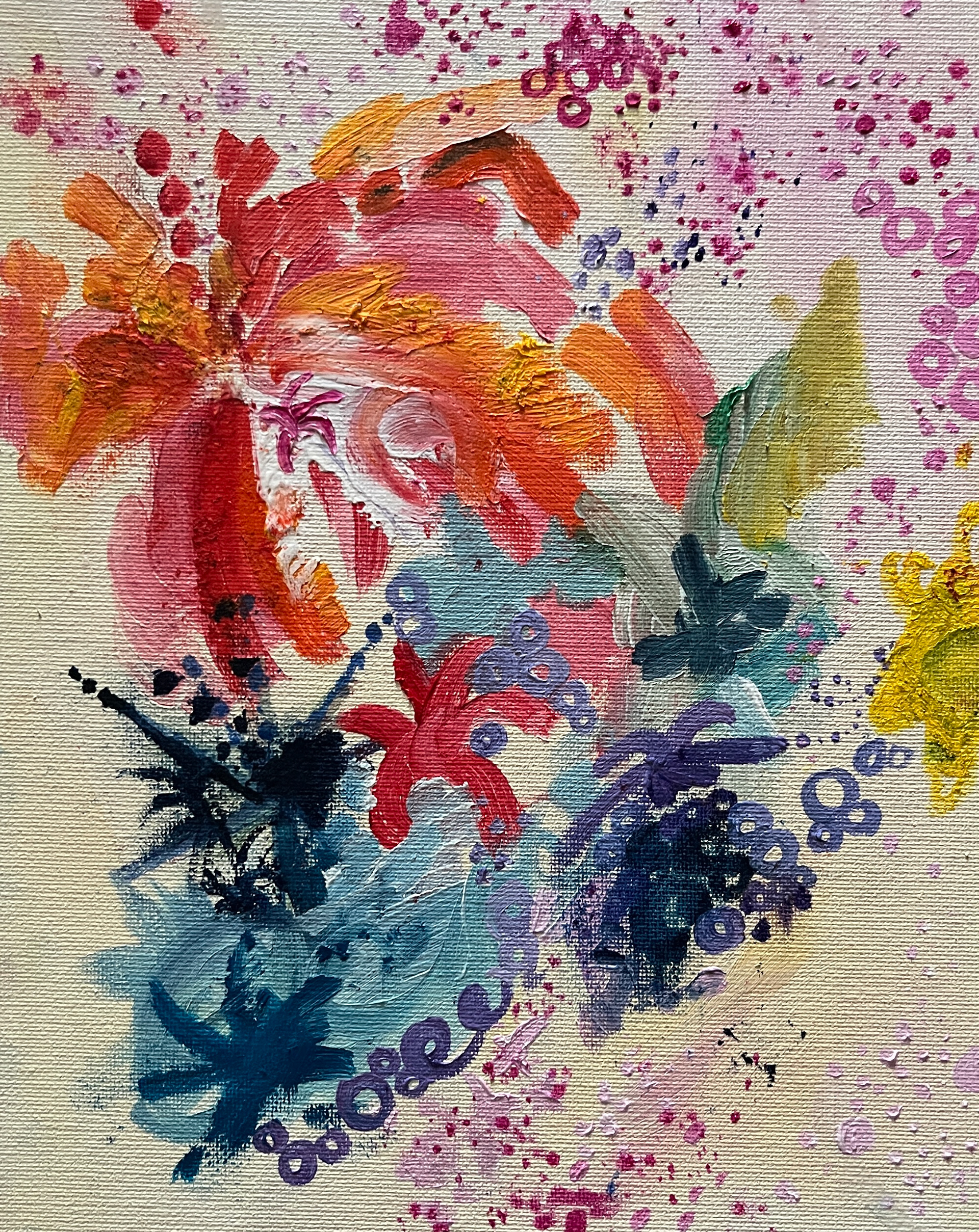 Inspired by Sandy Welch's "Rose' on a Summer Day" painting. The second attempt at a rose being held in a vase. The main focal point is the rose, but the rest is a chaotic blur. With a mess of color and brushes, the painting is now abstract rather than impressionist or realistic. This is an accurate representation of how we grow up and change ourselves both mentally and physically.
