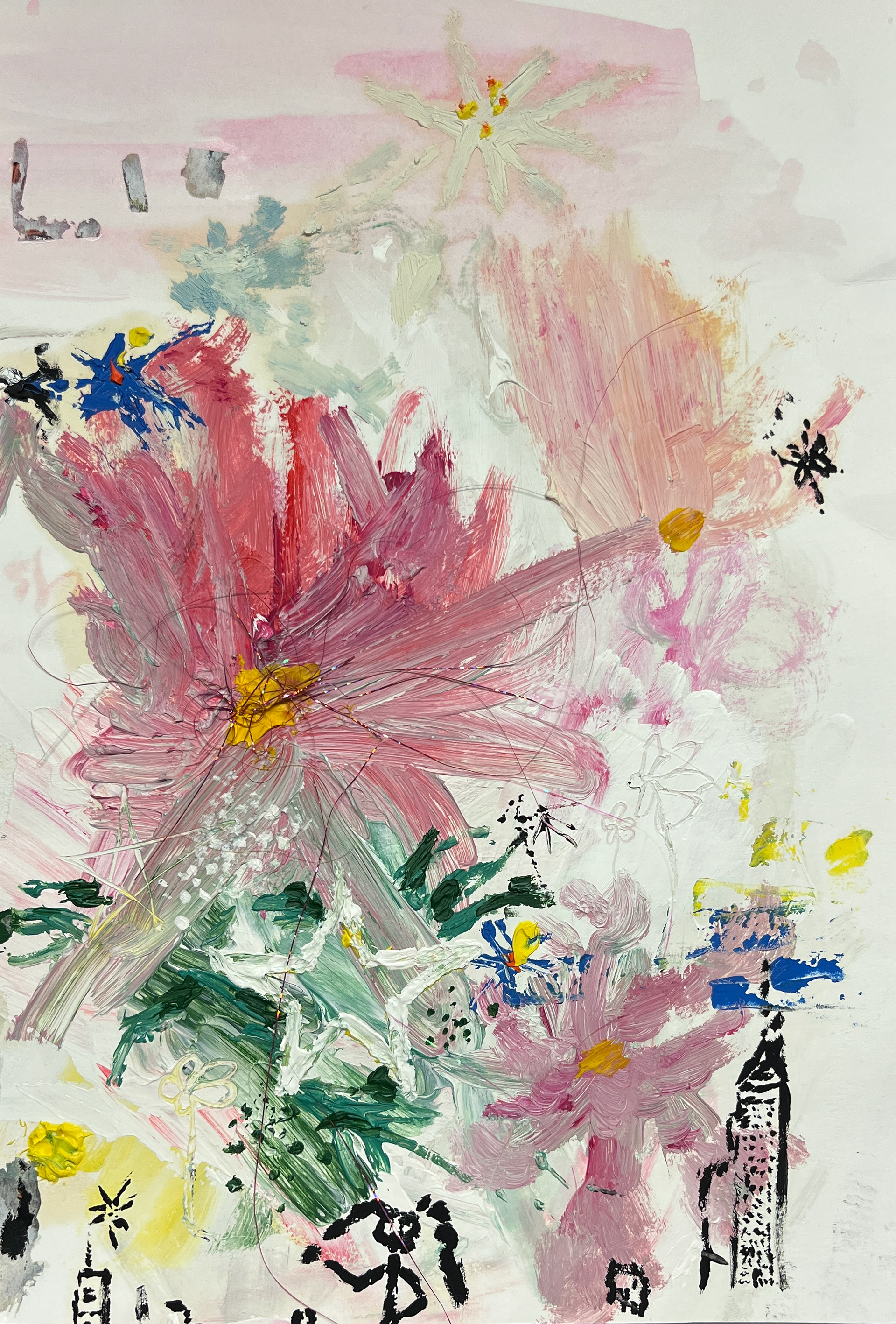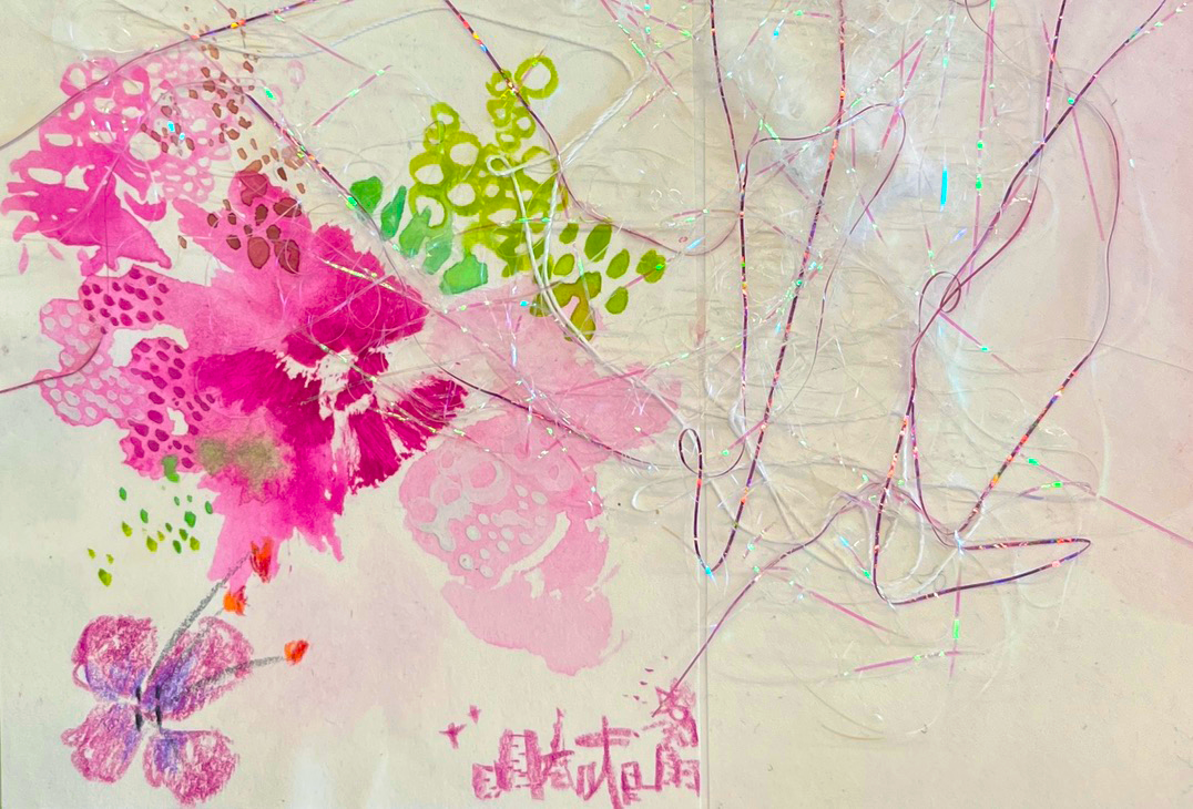 Pink Flower / Watercolor, Colored Pencil, Tinsel / 5 cm x 8 cm
